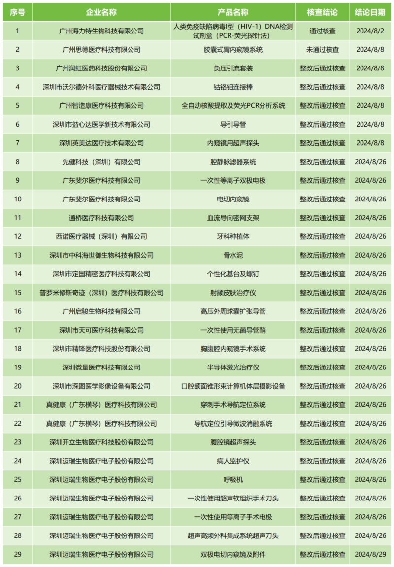 9月13日,廣東省藥監(jiān)局官網(wǎng)公布2024年8月醫(yī)療器械注冊(cè)質(zhì)量管理體系核查結(jié)果,包括普羅米修斯奇跡(深圳)醫(yī)療科技有限公司的射頻皮膚治療儀、深圳微量醫(yī)療科技有限公司的半導(dǎo)體激光治療儀、深圳邁瑞生物醫(yī)療電子股份有限公司的呼吸機(jī)共計(jì)29款產(chǎn)品,其中廣州海力特生物科技有限公司的人類免疫缺陷病毒I型(HIV-1)DNA檢測(cè)試劑盒(PCR-熒光探針法)核查結(jié)論為“通過核查”,廣州思德醫(yī)療科技有限公司的膠囊式胃內(nèi)窺鏡系統(tǒng)核查結(jié)論為“未通過核查”,其余均為“整改后通過核查”。具體明細(xì)見下方表格: