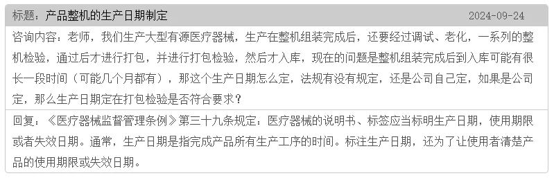 根據(jù)國家藥監(jiān)局食品藥品審核查驗中心的答復,《醫(yī)療器械監(jiān)督管理條例》第三十九條規(guī)定:醫(yī)療器械的說明書、標簽應(yīng)當標明生產(chǎn)日期,使用期限或者失效日期。通常,生產(chǎn)日期是指完成產(chǎn)品所有生產(chǎn)工序的時間。標注生產(chǎn)日期,還為了讓使用者清楚產(chǎn)品的使用期限或失效日期。