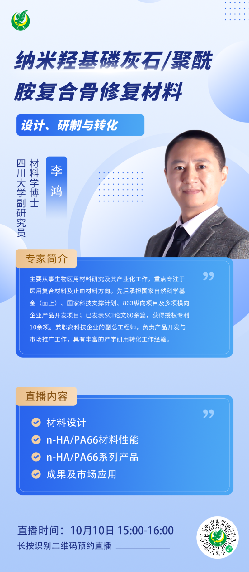 10月10日下午3點(diǎn),李老師給大家?guī)?/span>《納米羥基磷灰石/聚酰胺復(fù)合骨修復(fù)材料的設(shè)計(jì)、研制與轉(zhuǎn)化》,將從材料設(shè)計(jì)、材料性能、研究成果及市場應(yīng)用等方面給大家詳細(xì)介紹,對此類高分子材料感興趣的朋友千萬不要錯(cuò)過了哦~