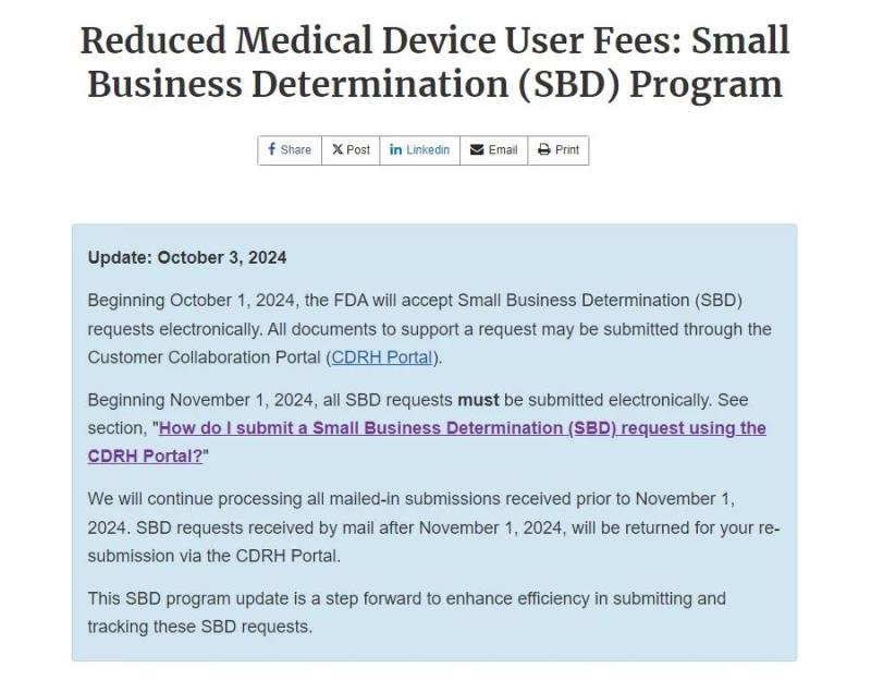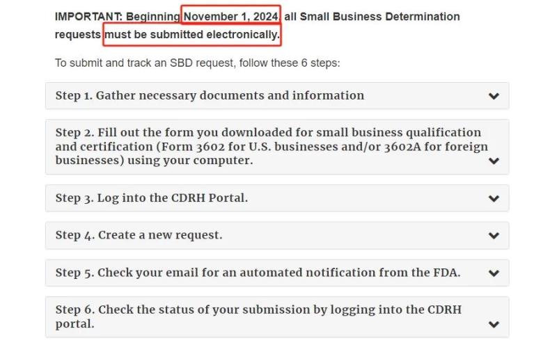 近日,F(xiàn)DA發(fā)布了最新公告,自2024年11月1日起,所有小企業(yè)資質(zhì)申請(qǐng)(Small Business Determination,SBD)必須通過(guò)FDA的CDRH客戶協(xié)作門(mén)戶(CDRH Portal)進(jìn)行電子提交。此舉旨在提高申請(qǐng)效率,縮短審批周期,并加強(qiáng)整個(gè)申請(qǐng)過(guò)程的透明度。