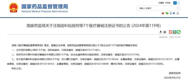 10月9日,國家藥監(jiān)局發(fā)布一則醫(yī)療器械注冊證注銷公告,公告顯示,該局已依法注銷古莎齒科有限公司、深圳市沃爾德外科醫(yī)療器械技術(shù)有限公司等3家企業(yè)共計7個產(chǎn)品的醫(yī)療器械注冊證,具體如下: