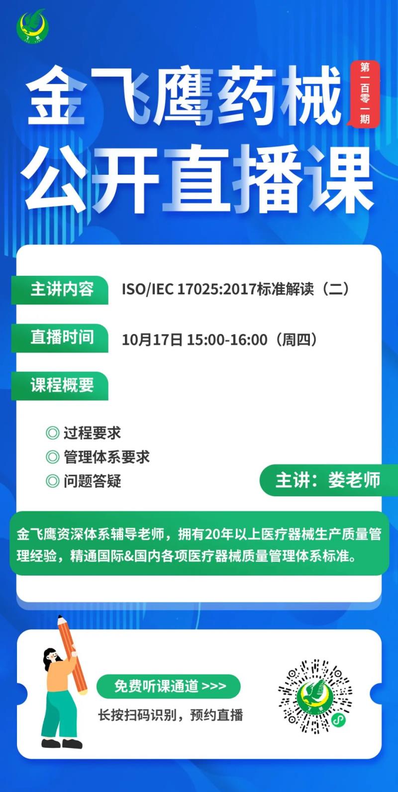 10月17日下午3點(diǎn),金飛鷹高級項目咨詢師,從事GMP管理相關(guān)工作20年,精通國際&國內(nèi)各項醫(yī)療器械質(zhì)量管理體系標(biāo)準(zhǔn)的婁老師給大家?guī)怼禝SO/IEC 17025:2017標(biāo)準(zhǔn)解讀(二),培訓(xùn)內(nèi)容包過程要求、管理體系要求及問題答疑,想聽課的朋友記得提前預(yù)約哦!