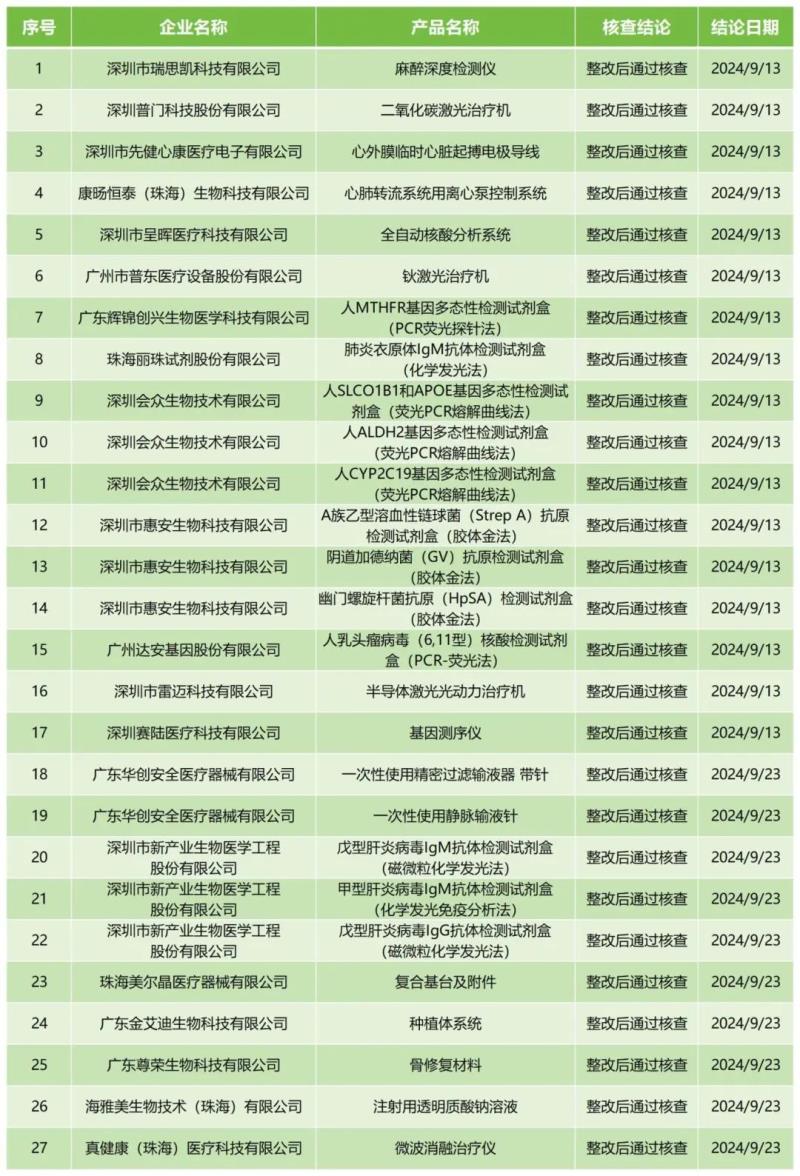 10月17日,廣東省藥監(jiān)局官網(wǎng)公布2024年9月醫(yī)療器械注冊(cè)質(zhì)量管理體系核查結(jié)果,包括海雅美生物技術(shù)(珠海)有限公司的注射用透明質(zhì)酸鈉溶液、深圳普門科技股份有限公司的二氧化碳激光治療機(jī)、廣州市普東醫(yī)療設(shè)備股份有限公司的鈥激光治療機(jī)共計(jì)27款產(chǎn)品,核查結(jié)論均為“整改后通過核查”。具體明細(xì)見下方表格:
