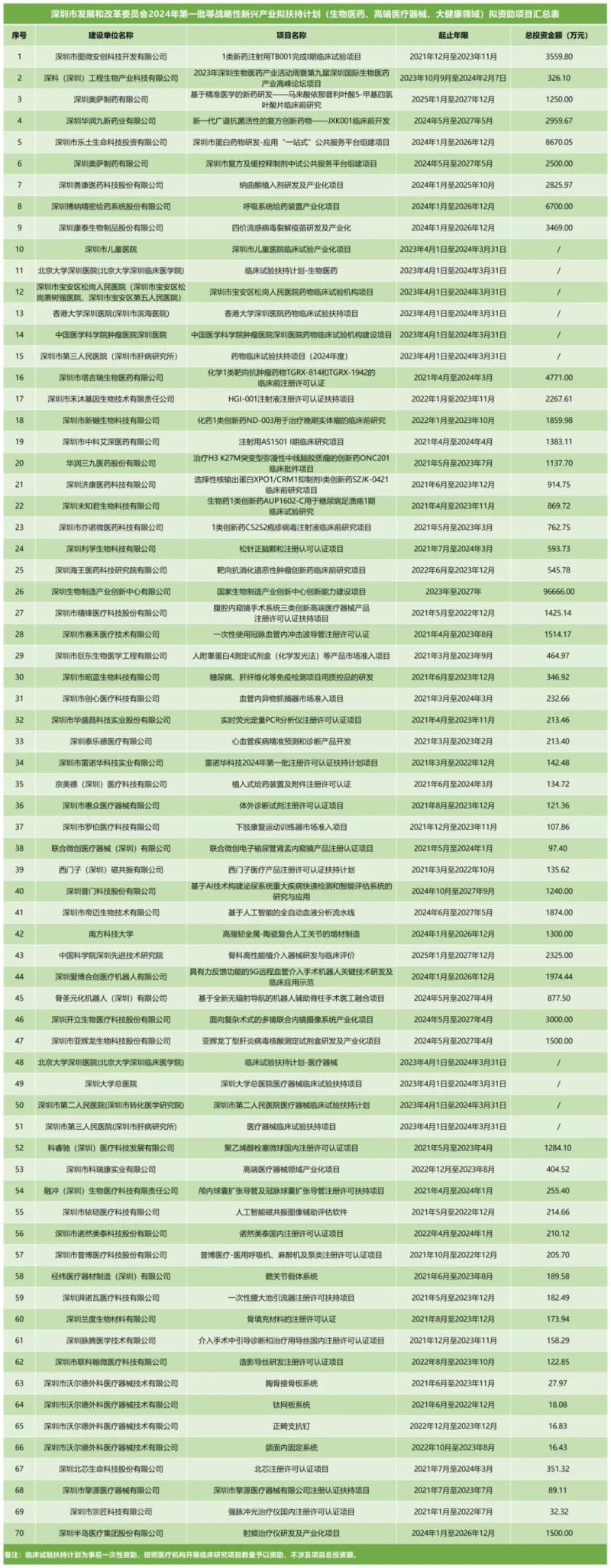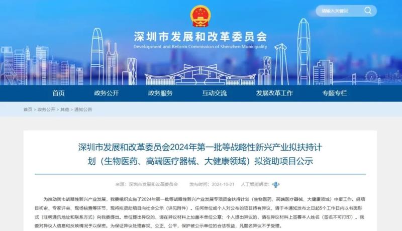 10月21日,深圳市發(fā)展和改革委員會發(fā)布了2024年第一批戰(zhàn)略性新興產(chǎn)業(yè)扶持計劃(生物醫(yī)藥、高端醫(yī)療器械、大健康領(lǐng)域)擬資助項目,公示時間為5個工作日。我們通過查閱附件表格后發(fā)現(xiàn),本批共有70個擬資助項目,包括醫(yī)藥領(lǐng)域臨床前研究、臨床試驗扶持、注冊許可扶持等,總投資金額最高的為96666萬元。深圳發(fā)改委將根據(jù)此前公布的相應(yīng)領(lǐng)域的專項資金項目申報指南,按總投資金額的一定比例對企業(yè)進(jìn)行補貼。