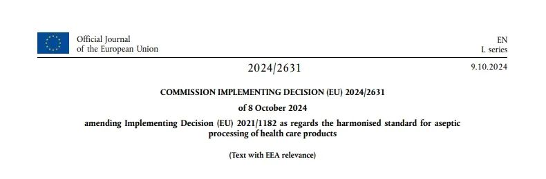 近日,歐盟官方日報發(fā)布了EU 2024/2631:關于修訂(EU) 2021/1182號實施決定中有關保健品無菌加工的協(xié)調標準內容。該標準的實施日期為2024年10月9日。