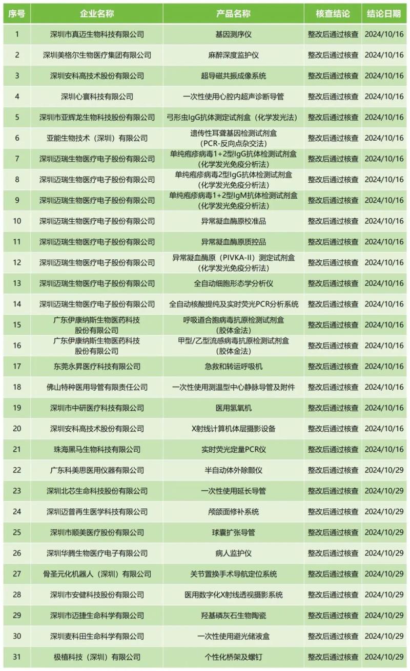 11月11日,廣東省藥監(jiān)局官網(wǎng)公布2024年10月醫(yī)療器械注冊質(zhì)量管理體系核查結(jié)果,包括深圳市真邁生物科技有限公司基因測序儀、深圳市中研醫(yī)療科技有限公司的醫(yī)用氫氧機(jī)、廣東科美思醫(yī)用儀器有限公司的半自動體外除顫儀共計(jì)31款產(chǎn)品,核查結(jié)論均為“整改后通過核查”。具體明細(xì)見下方表格: