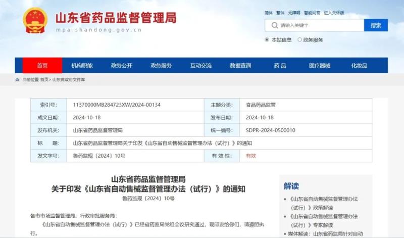日前,山東省藥監(jiān)局發(fā)布《山東省自動(dòng)售械監(jiān)督管理辦法(試行)》(以下簡(jiǎn)稱《辦法》),并宣布2024年11月18日起施行。