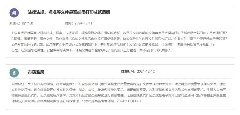 根據(jù)北京市藥監(jiān)局的答復(fù),企業(yè)應(yīng)依據(jù)《醫(yī)療器械生產(chǎn)質(zhì)量管理規(guī)范》文件管理的相關(guān)要求,建立健全的質(zhì)量管理體系文件,建立文件控制程序,確立質(zhì)量管理體系文件的設(shè)計、制定、審核、批準和發(fā)放的要求,滿足追溯需要。未對質(zhì)量體系文件的形式作出明確要求。注冊人應(yīng)當(dāng)嚴格按照法規(guī)及文件、記錄控制程序要求,對文件及記錄的受控形式進行有效管理。無論是紙質(zhì)文件記錄或是電子文件記錄,均應(yīng)按照《醫(yī)療器械生產(chǎn)質(zhì)量管理規(guī)范》中文件記錄相關(guān)控制要求進行有效管理。