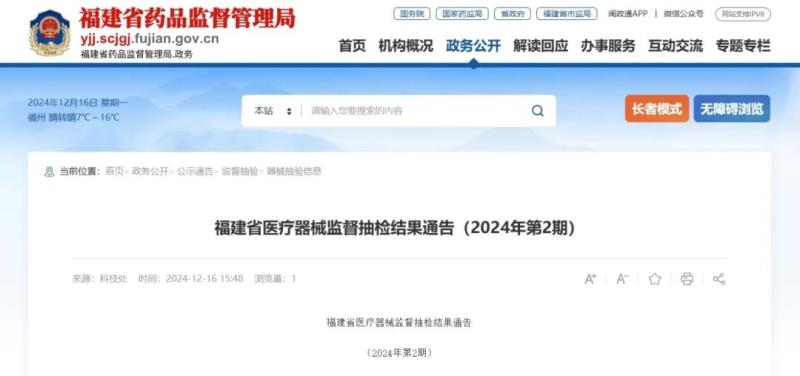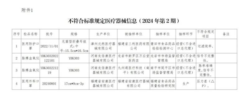 12月16日,福建省藥監(jiān)局發(fā)布《福建省醫(yī)療器械監(jiān)督抽檢結(jié)果通告(2024年第2期)》,共通告了醫(yī)用防護口罩、脈搏血氧儀等4批次不符合標準規(guī)定的醫(yī)療器械產(chǎn)品,不符合規(guī)定項目有過濾效率、信號不完整性等,具體明細如下: