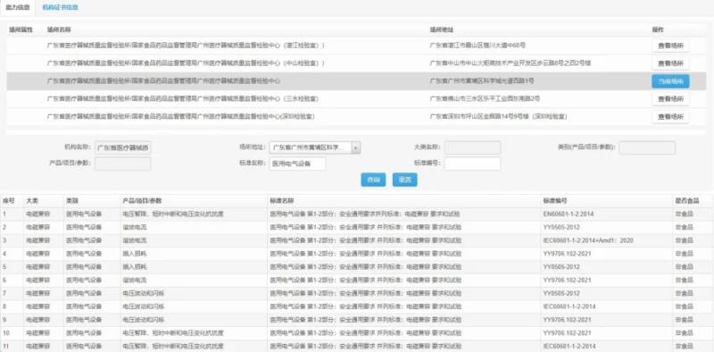 http://cma.cnca.cn/cma/solr/tBzAbilitySearch/list),輸入機(jī)構(gòu)名稱,可查詢到獲證機(jī)構(gòu)的證書(shū)相關(guān)信息及承檢目錄。