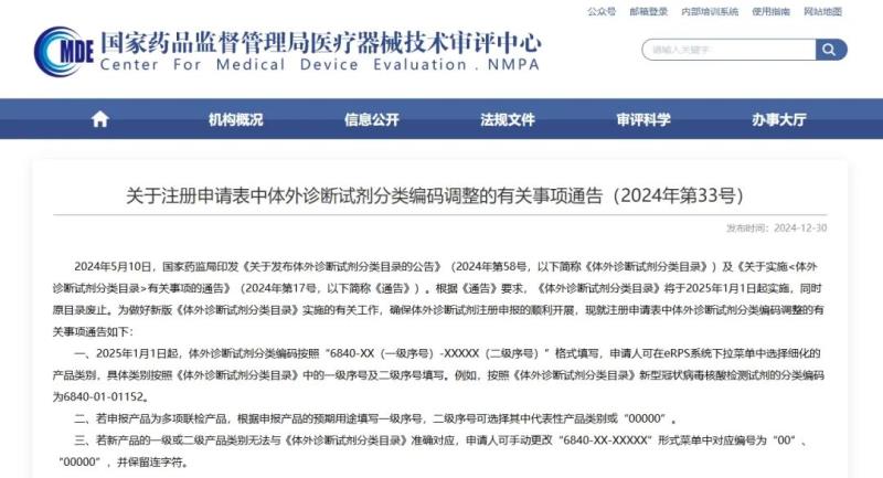 12月30日,國(guó)家藥監(jiān)局器審中心發(fā)布通告稱(chēng),新版《體外診斷試劑分類(lèi)目錄》將于2025年1月1日起實(shí)施,同時(shí)原目錄廢止。為做好新版《體外診斷試劑分類(lèi)目錄》實(shí)施的有關(guān)工作,確保體外診斷試劑注冊(cè)申報(bào)的順利開(kāi)展,現(xiàn)就注冊(cè)申請(qǐng)表中體外診斷試劑分類(lèi)編碼調(diào)整的有關(guān)事項(xiàng)通告如下: