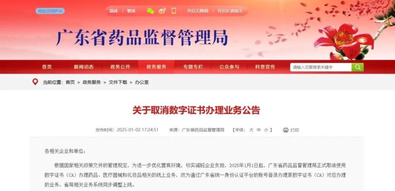 一、廣東省藥監(jiān)行業(yè)企業(yè)用戶免費領用的數字證書(含移動數字證書)通道同步關閉,已申領的企業(yè)用戶可持續(xù)使用至該數字證書有效期結束。 二、原使用數字證書(CA)辦理業(yè)務的通道繼續(xù)保留至業(yè)務辦理完畢,請各相關企業(yè)和單位在業(yè)務辦理完結后盡快完成切換。 三、在使用過程中有任何疑問和建議,請撥打020-37886123、020-37886352進行咨詢及答疑。