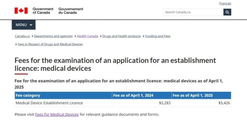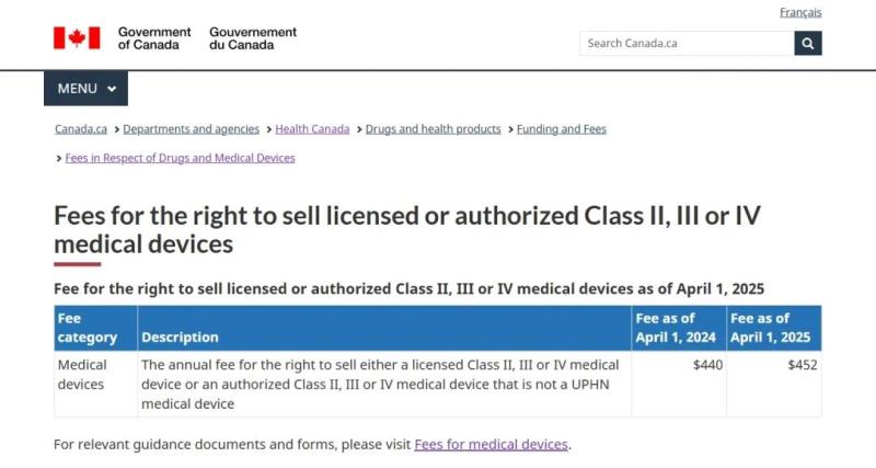 加拿大衛(wèi)生部更新2025財年MDL&MDEL收費標準