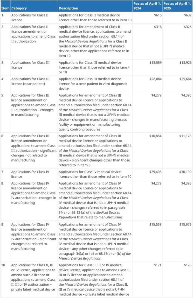 近日,加拿大衛(wèi)生部在其官網上公布了2025財年(2025年4月1日-2026年3月31日)MDEL申請費用,Ⅱ、Ⅲ、Ⅳ類醫(yī)療器械MDL審核費用以及年度更新費用,較之上一財年均有一定幅度的上漲,具體見下方圖片: