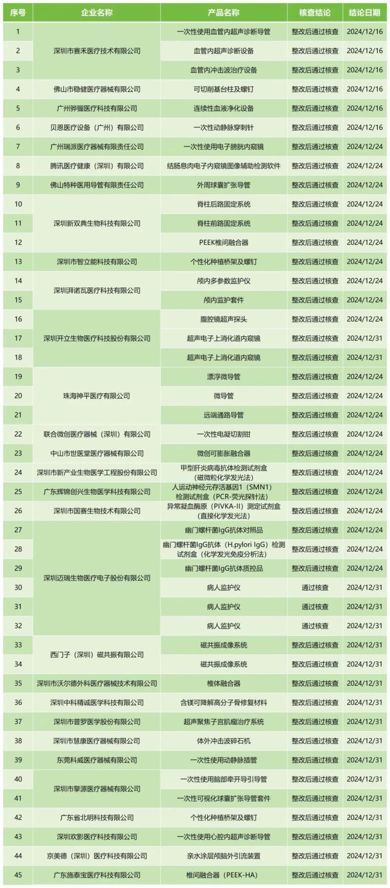 1月10日,廣東省藥監(jiān)局官網(wǎng)公布2024年12月醫(yī)療器械注冊(cè)質(zhì)量管理體系核查結(jié)果,包括佛山市穩(wěn)健醫(yī)療器械有限公司的可切削基臺(tái)柱及螺釘、騰訊醫(yī)療健康(深圳)有限公司結(jié)腸息肉電子內(nèi)窺鏡圖像輔助檢測(cè)軟件、深圳邁瑞生物醫(yī)療電子股份有限公司的病人監(jiān)護(hù)儀共計(jì)45款產(chǎn)品,核查結(jié)論均為“整改后通過(guò)核查”。具體明細(xì)見(jiàn)下方表格: