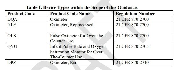 1、設(shè)備描述:設(shè)備適用范圍增加了產(chǎn)品代碼為QYU,OLK的血氧儀,其中QYU為非處方嬰兒脈率和血氧飽和度監(jiān)測儀,OLK為非處方使用的脈搏血氧儀。適用的血氧儀設(shè)備產(chǎn)品代碼見下表。