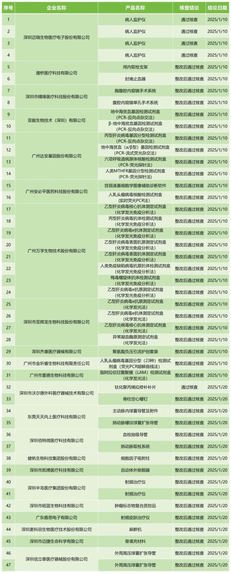 2月12日,廣東省藥監(jiān)局官網(wǎng)公布2025年1月醫(yī)療器械注冊質量管理體系核查結果,包括深圳邁瑞生物醫(yī)療電子股份有限公司的四款病人監(jiān)護儀、深圳半島醫(yī)療集團股份有限公司的兩款射頻治療儀、廣東雅思電子有限公司的射頻皮膚治療儀等共計47款產(chǎn)品,其中有五款產(chǎn)品核查結論為“通過核查”,其余均為“整改后通過核查”。具體明細見下方表格: