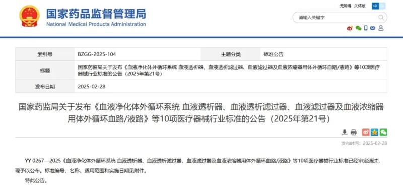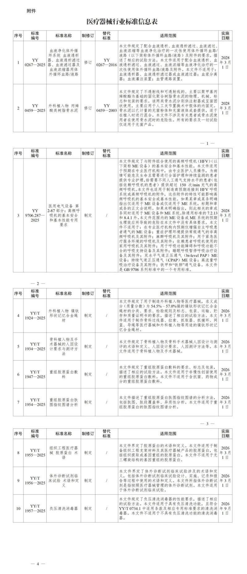 2月28日,國家藥監(jiān)局發(fā)布YY 0267-2025《血液凈化體外循環(huán)系統(tǒng) 血液透析器、血液透析濾過器、血液濾過器及血液濃縮器用體外循環(huán)血路/液路》、YY 9706.287-2025《醫(yī)用電氣設(shè)備 第2-87部分:高頻呼吸機(jī)的基本安全和基本性能專用要求》、YY/T 1947-2025重組膠原蛋白敷料》等10項(xiàng)醫(yī)療器械行業(yè)標(biāo)準(zhǔn),其中2項(xiàng)標(biāo)準(zhǔn)為修訂,8項(xiàng)為制定,最早自2026年3月1日起實(shí)施,具體明細(xì)如下: