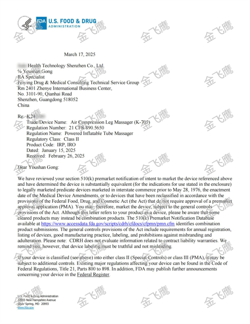 3月17日,金飛鷹輔導(dǎo)的深圳一家企業(yè)成功獲批氣壓腿部按摩器(Air Compression Leg Massager)510(k),這不僅標(biāo)志著該產(chǎn)品拿到了美國(guó)市場(chǎng)的“通行證”,也體現(xiàn)了金飛鷹在醫(yī)療器械注冊(cè)領(lǐng)域的專業(yè)實(shí)力。