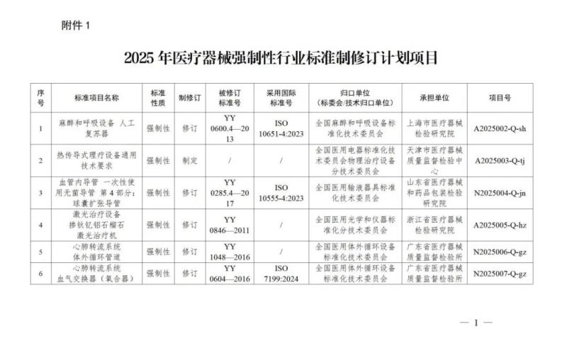 3月19日,國家藥監(jiān)局正式發(fā)布《關(guān)于印發(fā)2025年醫(yī)療器械行業(yè)標(biāo)準(zhǔn)制修訂計(jì)劃項(xiàng)目的通知》,共確定了2025年85項(xiàng)醫(yī)療器械行業(yè)標(biāo)準(zhǔn)制修訂計(jì)劃項(xiàng)目,其中包括《熱傳導(dǎo)式理療設(shè)備通用技術(shù)要求》《激光治療設(shè)備 摻鈥釔鋁石榴石激光治療機(jī)》等6項(xiàng)強(qiáng)制性醫(yī)療器械行業(yè)標(biāo)準(zhǔn)及《重組膠原蛋白降解試驗(yàn)方法通則》《接觸性創(chuàng)面敷料試驗(yàn)方法 第7部分:微生物學(xué)》《接觸性創(chuàng)面敷料試驗(yàn)方法 第8部分:生物學(xué)》等79項(xiàng)推薦性醫(yī)療器械行業(yè)標(biāo)準(zhǔn),同時(shí)明確了歸口單位承擔(dān)單位,具體明細(xì)如下: