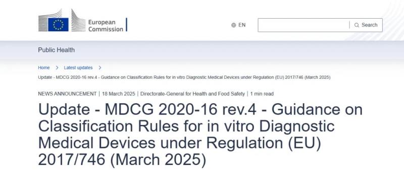近日,歐盟MDCG小組發(fā)布最新指南MDCG 2020-16 Rev.4 -Guidance on Classification Rules for in vitro Diagnostic Medical Devices under Regulation (EU) 2017/746《IVDR法規(guī)下體外診斷醫(yī)療器械分類規(guī)則指南》 ,這是繼2024年7月該指南發(fā)布第三版后的再次更新,本次更新共有以下內(nèi)容: