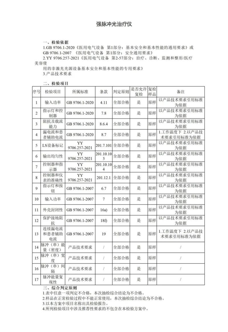 針對強脈沖光治療儀,國家藥監(jiān)局共提出了漏電流和患者輔助電流、LS設(shè)備標記、輸出均勻性、脈沖(串)寬度、脈沖(串)間隔等17個檢驗項目,同時指出,任意一項判定不合格,抽檢綜合結(jié)論即為不合格。具體如下: