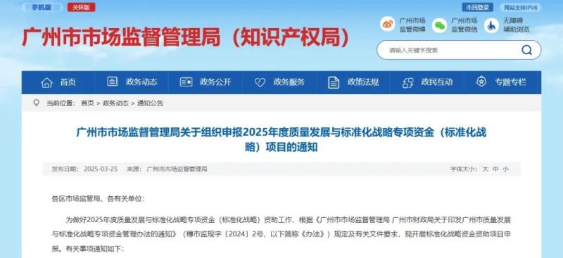 近日,廣州市市場(chǎng)監(jiān)督管理局發(fā)布《關(guān)于組織申報(bào)2025年度質(zhì)量發(fā)展與標(biāo)準(zhǔn)化戰(zhàn)略專項(xiàng)資金(標(biāo)準(zhǔn)化戰(zhàn)略)項(xiàng)目的通知》(以下簡稱《通知》),共提到了7種項(xiàng)目申報(bào)范圍,包括標(biāo)準(zhǔn)制定修訂項(xiàng)目、標(biāo)準(zhǔn)化組織項(xiàng)目、標(biāo)準(zhǔn)化研究項(xiàng)目等,具體事項(xiàng)如下: