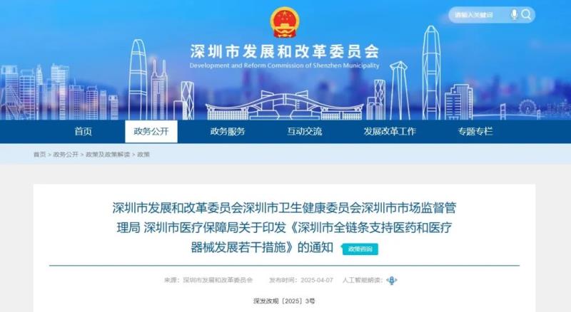 4月7日,深圳市發(fā)展和改革委員會(huì)、深圳市衛(wèi)生健康委員會(huì)、深圳市市場(chǎng)監(jiān)督管理局、深圳市醫(yī)療保障局四部門聯(lián)合發(fā)布《深圳市全鏈條支持醫(yī)藥和醫(yī)療器械發(fā)展若干措施》(以下簡(jiǎn)稱《措施》),聚焦研發(fā)創(chuàng)新、人工智能應(yīng)用、臨床試驗(yàn)、注冊(cè)審批、生產(chǎn)制造、推廣應(yīng)用、企業(yè)出海、人才與金融賦能、投資促進(jìn)9大方面,共提出32條措施,以充分發(fā)揮深圳科技創(chuàng)新、先進(jìn)制造、深港合作等優(yōu)勢(shì),大力發(fā)展醫(yī)藥和醫(yī)療器械研發(fā)經(jīng)濟(jì),全鏈條支持醫(yī)藥和醫(yī)療器械產(chǎn)業(yè)快速發(fā)展做大做強(qiáng),將深圳建設(shè)成為國內(nèi)領(lǐng)先、國際一流的醫(yī)藥和醫(yī)療器械產(chǎn)業(yè)集聚發(fā)展高地。