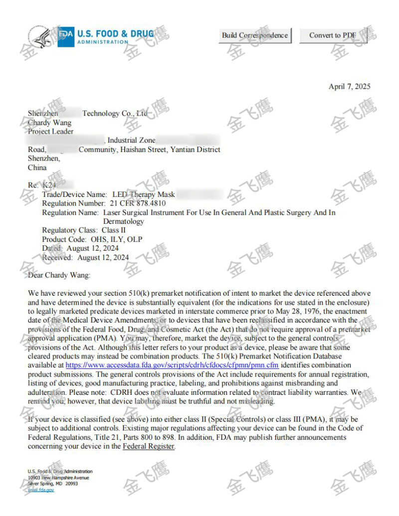 ↓畢竟只有那些有挑戰(zhàn)性的案例 才能更好地展現(xiàn)我們的專業(yè)實(shí)力 那么既然LED面罩的510(k)案例 為什么這次還要特別拿出來說呢? 接下來請(qǐng)聽我細(xì)細(xì)道來 它有四種模式 分別對(duì)應(yīng)不同的預(yù)期用途 ? 藍(lán)光模式(460nm)-治療痤瘡 更值得一提的是 2?? 面罩+頸罩組合款 由于紅光及混合光均有祛皺作用 那么對(duì)于該產(chǎn)品的第二個(gè)型號(hào)來說 面部+頸部祛皺 都結(jié)合到一起了 而在這個(gè)成功案例的背后 凝聚著金飛鷹團(tuán)隊(duì) ? 對(duì)FDA法規(guī)的深刻理解 ? 對(duì)光療設(shè)備的專業(yè)認(rèn)知 所以 假如您也正在研發(fā)或有意向研發(fā)此類產(chǎn)品 記得聯(lián)系我們~ 當(dāng)然,假如您有其他產(chǎn)品的美國(guó)FDA認(rèn)證需求 也歡迎隨時(shí)聯(lián)系我們咨詢 ?400-888-7587 國(guó)內(nèi)外4000+服務(wù)案例支撐 定能幫您加速產(chǎn)品上市進(jìn)程~