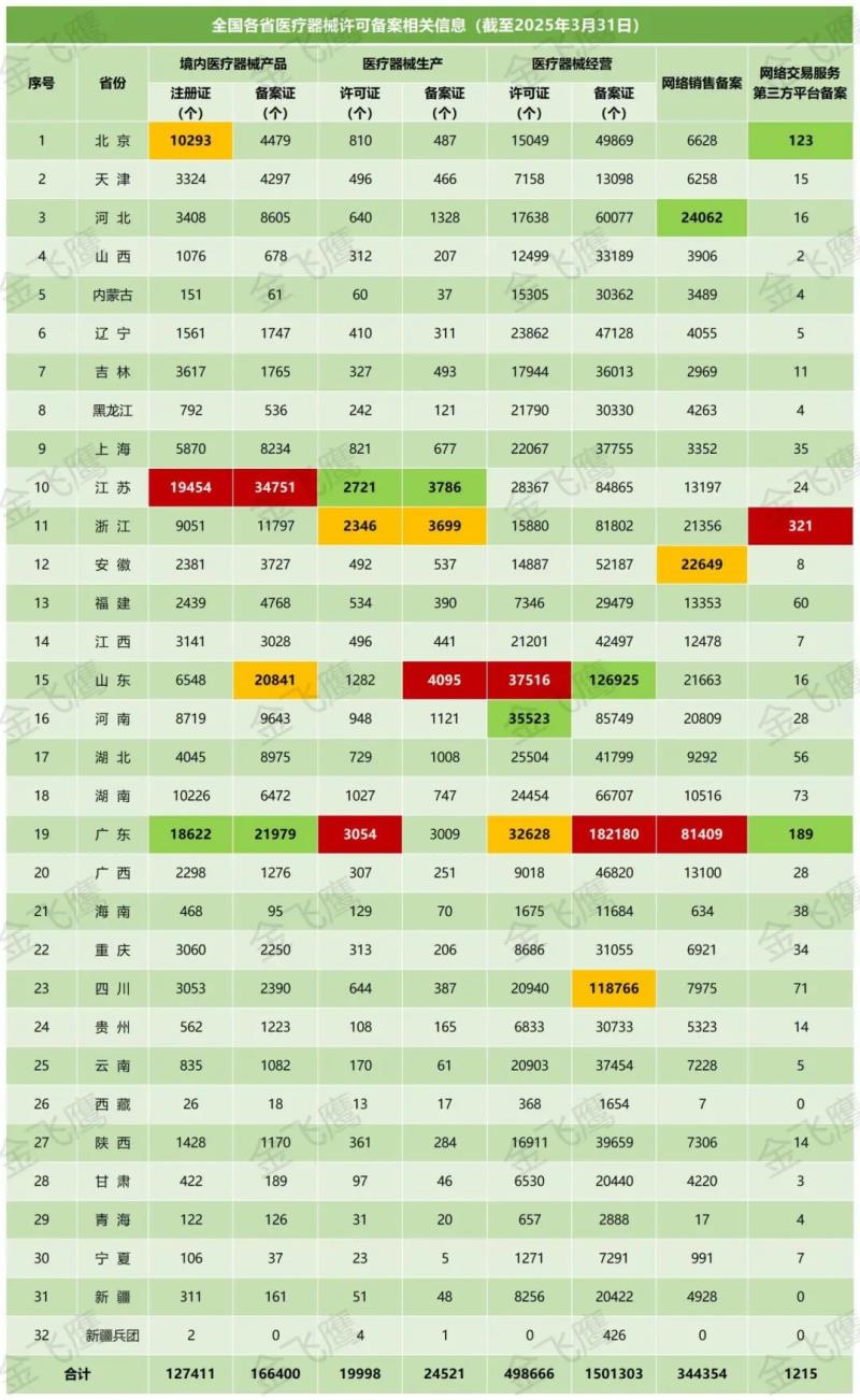 近日,國家藥監(jiān)局公布了截至2025年3月31日各省有效期內(nèi)醫(yī)療器械產(chǎn)品注冊備案、醫(yī)療器械生產(chǎn)企業(yè)許可備案等信息,老規(guī)矩,金飛鷹小編對此稍作編輯,標注紅色、綠色、黃色的分別為前三甲。