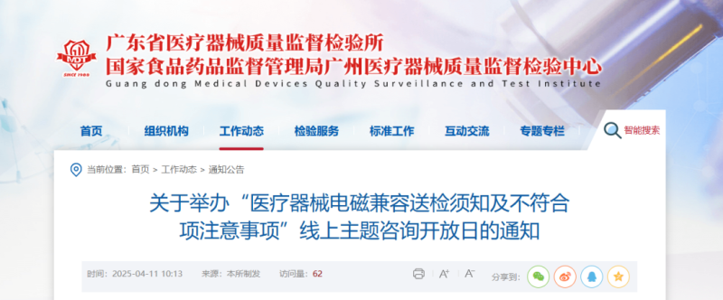 近日,廣東省醫(yī)療器械質(zhì)量監(jiān)督檢驗(yàn)所官網(wǎng)發(fā)布通知,定于4月25日(周五)舉辦“醫(yī)療器械電磁兼容送檢須知及不符合項(xiàng)注意事項(xiàng)”線上主題咨詢開放日活動(dòng),具體時(shí)間及參會(huì)方式如下: