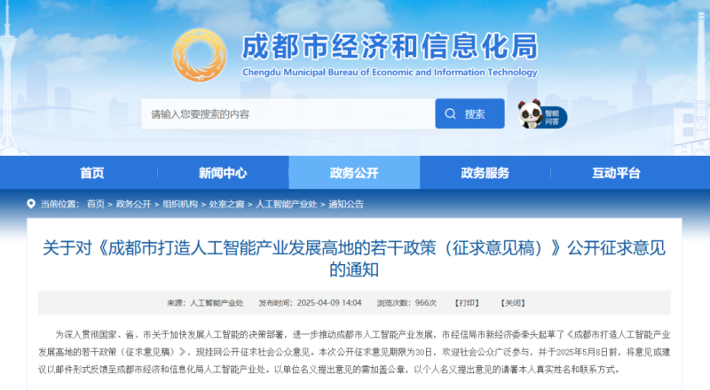 近日,成都市經(jīng)濟和信息化局發(fā)布《成都市打造人工智能產(chǎn)業(yè)發(fā)展高地的若干政策(征求意見稿)》(以下簡稱《政策》),并向社會公開征求意見?!墩摺窂淖鰪姰a(chǎn)業(yè)載體、拓展場景應(yīng)用、優(yōu)化算力供給、推動模型應(yīng)用、盤活數(shù)據(jù)資源、鼓勵企業(yè)上榜、支持品牌推廣、引育頂尖人才、強化金融支持九個方面入手,進一步推動成都市人工智能產(chǎn)業(yè)發(fā)展,助推打造人工智能產(chǎn)業(yè)發(fā)展高地。