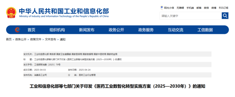 近日,國家工業(yè)和信息化部、商務(wù)部、衛(wèi)健委等七部門發(fā)布《醫(yī)藥工業(yè)數(shù)智化轉(zhuǎn)型實施方案(2025-2030年)》(以下簡稱《實施方案》),以深入推進人工智能賦能新型工業(yè)化,推動新一代信息技術(shù)與醫(yī)藥產(chǎn)業(yè)鏈深度融合,加快推進醫(yī)藥工業(yè)數(shù)智化轉(zhuǎn)型,進一步提高企業(yè)核心競爭力,提升藥品質(zhì)量安全水平,增強供應(yīng)保障能力,培育和發(fā)展新質(zhì)生產(chǎn)力,促進醫(yī)藥工業(yè)高質(zhì)量發(fā)展。