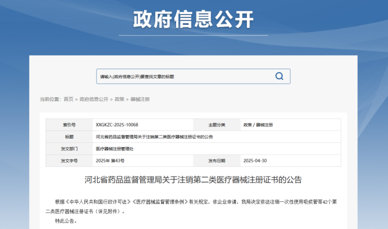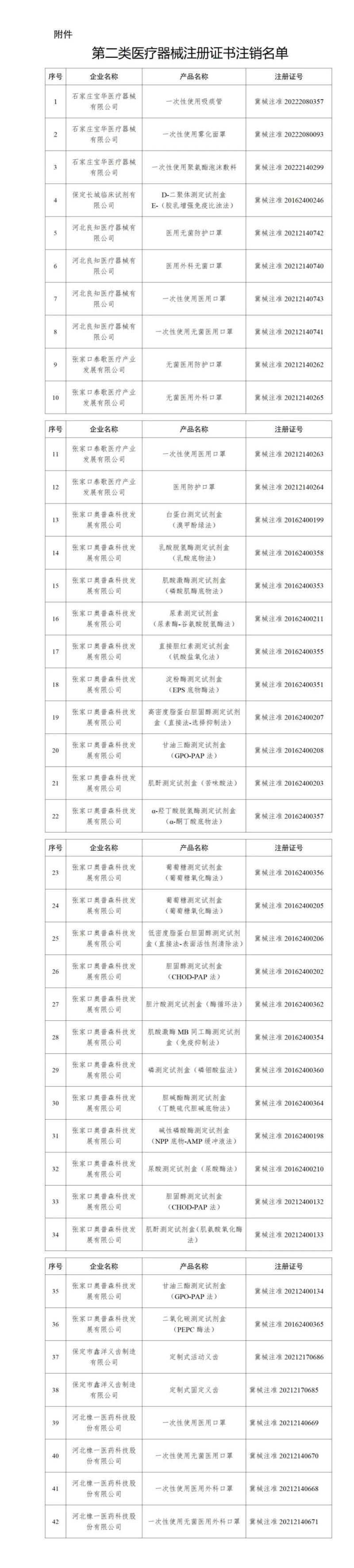 河北藥監(jiān)局:以下42張醫(yī)療器械注冊證已被注銷!