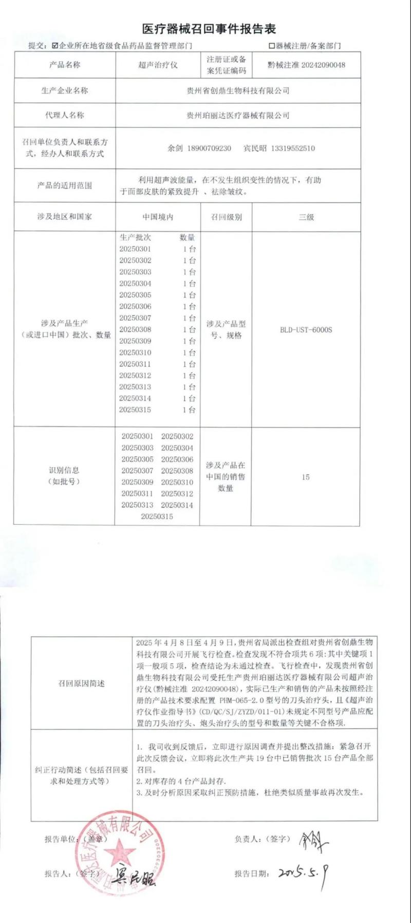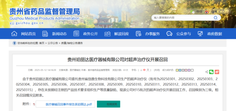 5月12日,貴州省藥監(jiān)局發(fā)布一則召回公告,其中提到,由于貴州珀麗達醫(yī)療器械有限公司委托貴州省創(chuàng)鼎生物科技有限公司生產(chǎn)的超聲治療儀(產(chǎn)品適用范圍:利用超聲波能量,在不發(fā)生組織變性的情況下,有助于面部皮膚的緊致提升、祛除皺紋,存在未按照經(jīng)注冊的產(chǎn)品技術要求組織生產(chǎn)等質(zhì)量缺陷,現(xiàn)該公司對15批次超聲治療儀開展召回工作,召回級別為三級。具體召回情況如下: