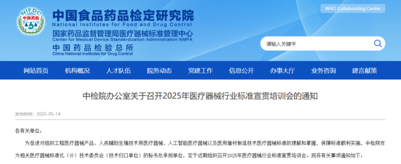 5月14日,中檢院發(fā)布一則2025年醫(yī)療器械行業(yè)標準宣貫培訓會的通知,其中提到,該院近期將對組織工程醫(yī)療器械產(chǎn)品、人類輔助生殖技術用醫(yī)療器械、人工智能醫(yī)療器械以及醫(yī)用增材制造技術醫(yī)療器械標準進行宣貫培訓。有關事項具體如下: