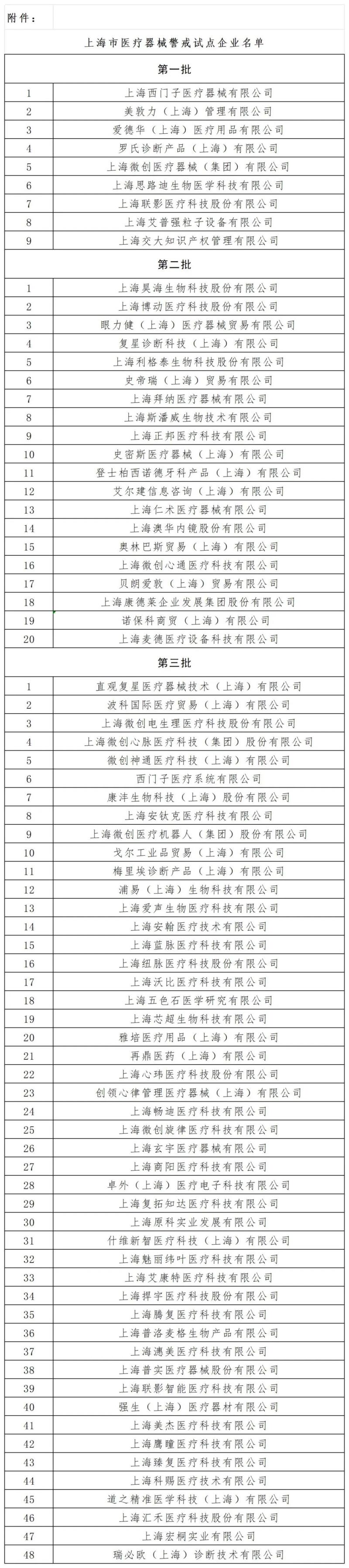 5月21日,上海市藥監(jiān)局發(fā)布該市醫(yī)療器械注冊人警戒試點企業(yè)名單,其中提到,該局近兩年來先后將三批77家醫(yī)療器械注冊人納入警戒試點企業(yè)名單(具體見下圖),積極穩(wěn)妥推動上海市醫(yī)療器械注冊人參與警戒試點工作。其中,上海市醫(yī)療器械創(chuàng)新產(chǎn)品注冊人均納入警戒試點,后續(xù)新增的創(chuàng)新醫(yī)療器械注冊人將不再另行發(fā)布。