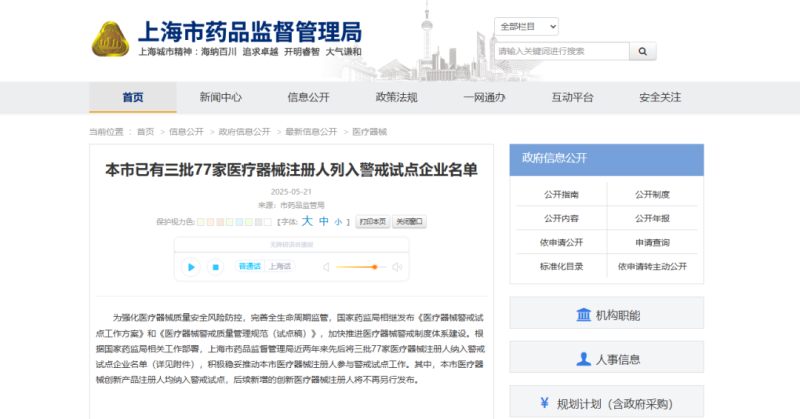 上海77家醫(yī)療器械注冊人警戒試點名單公布!