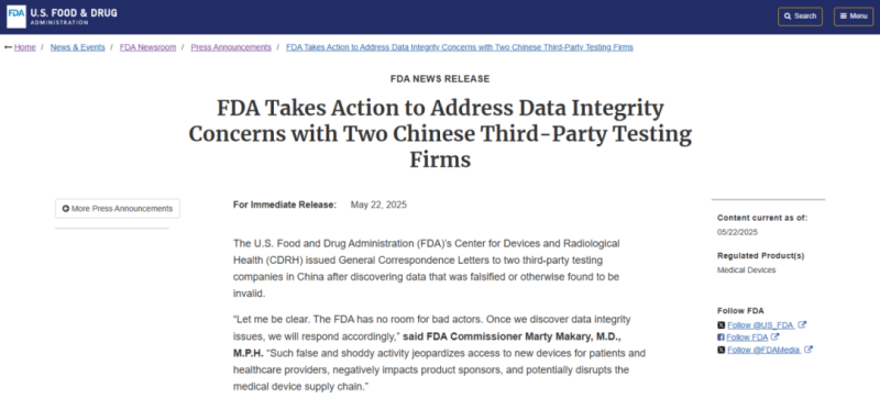 FDA最新通告!中國2家檢測機(jī)構(gòu)遭“封殺”