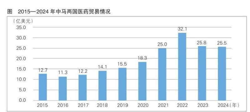 據(jù)中國海關(guān)統(tǒng)計(jì)數(shù)據(jù),中馬兩國醫(yī)藥貿(mào)易額由2015年的12.7億美元,增長至2024年的25.5億美元(詳見下圖),10年間復(fù)合增長率為7.22%,總體保持增長態(tài)勢(shì)。