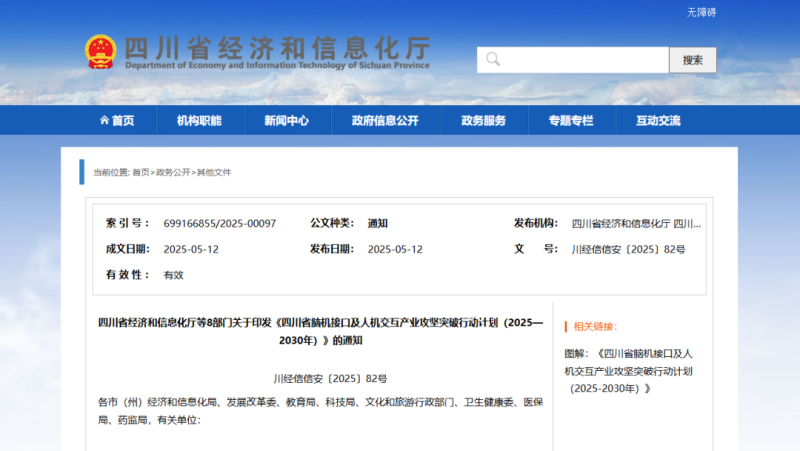 近日,四川省經(jīng)濟和信息化廳、四川省發(fā)展和改革委員會等8部門聯(lián)合發(fā)布《四川省腦機接口及人機交互產(chǎn)業(yè)攻堅突破行動計劃(2025—2030年)》(以下簡稱《行動計劃》),以搶占未來產(chǎn)業(yè)發(fā)展先機,加快形成新質(zhì)生產(chǎn)力,培育高質(zhì)量發(fā)展新動能。