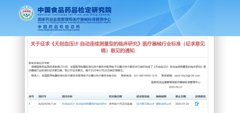 近日,國(guó)家藥監(jiān)局醫(yī)療器械標(biāo)準(zhǔn)管理中心發(fā)布《無(wú)創(chuàng)血壓計(jì) 自動(dòng)連續(xù)測(cè)量型的臨床研究》醫(yī)療器械行業(yè)標(biāo)準(zhǔn)(征求意見(jiàn)稿),并向社會(huì)公開(kāi)征求意見(jiàn)。