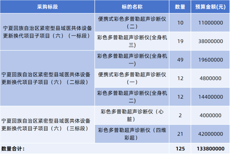 據(jù)了解,本次采購項目分為三個標段,總預(yù)算達 1.338 億元,涉及 125 臺彩色多普勒超聲診斷儀,涵蓋便攜式、全身機、心臟以及四維彩超。