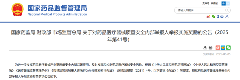 一、藥品醫(yī)療器械研制、生產(chǎn)、經(jīng)營企業(yè)和使用單位,藥品醫(yī)療器械網(wǎng)絡(luò)交易第三方平臺提供者以及其他組織(以下統(tǒng)稱企業(yè)及相關(guān)單位)的內(nèi)部員工、相關(guān)知情人,向藥品監(jiān)督管理部門實名舉報藥品醫(yī)療器械質(zhì)量安全重大違法行為,藥品監(jiān)督管理部門實施獎勵的,適用本公告。