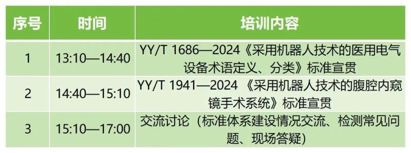 對YY/T 1686—2024《采用機器人技術(shù)的醫(yī)用電氣設(shè)備術(shù)語定義、分類》、YY/T 1941—2024《采用機器人技術(shù)的腹腔內(nèi)窺鏡手術(shù)系統(tǒng)》兩項行業(yè)標準進行宣貫培訓(xùn),具體時間安排如下: