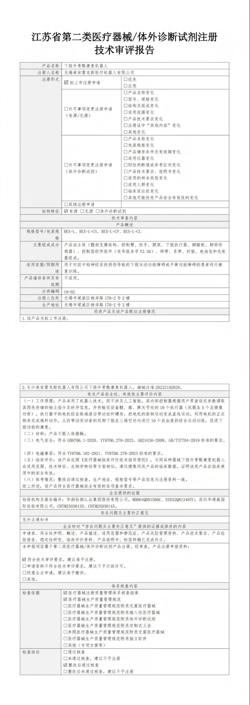 近日,江蘇省藥監(jiān)局公布了2025年5月批準(zhǔn)注冊的磁刺激治療儀、重組膠原蛋白液體敷料、生命體征檢測儀、一次性使用無菌皮膚滾針、短波治療儀、艾灸儀、醫(yī)用透明質(zhì)酸鈉凝膠敷料、下肢外骨骼康復(fù)機器人164醫(yī)療器械產(chǎn)品目錄,同時隨附了所有產(chǎn)品的技術(shù)審評報告,我們其中下肢外骨骼康復(fù)機器人預(yù)期用途用于對因中樞神經(jīng)系統(tǒng)損傷導(dǎo)致的下肢運動功能障礙或平衡功能障礙的患者進行康復(fù)訓(xùn)練)的技術(shù)審評報告以圖片形式轉(zhuǎn)載如下: