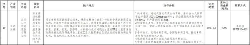 近日,四川省經(jīng)濟和信息化廳發(fā)布《關(guān)于開展2025年第三批企業(yè)找技術(shù)“雙向揭榜掛帥”項目申報工作的通知》(以下簡稱《通知》),對應(yīng)2025年第三批企業(yè)找技術(shù)“雙向揭榜掛帥”榜單的20家發(fā)榜企業(yè)的技術(shù)需求,公開征集解決方案。本次涉及人工智能、航空航天、高端能源設(shè)備、低空經(jīng)濟、新能源汽車及動力電池、軟件和信息服務(wù)、醫(yī)藥健康、農(nóng)產(chǎn)品精深加工8個產(chǎn)業(yè)領(lǐng)域,其中有一個醫(yī)藥健康領(lǐng)域項目——“醫(yī)用高活性修復(fù)新材料重組全長人膠原蛋白產(chǎn)業(yè)化技術(shù)攻關(guān)及應(yīng)用”,具體明細如下: