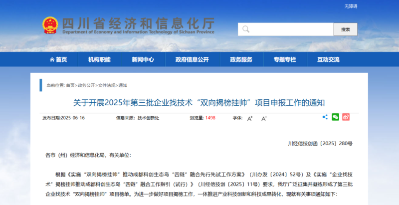 (二)系統(tǒng)填報。6月30日18:00前,揭榜方須登錄四川省經(jīng)濟和信息化廳官方網(wǎng)站“益企服務(wù)超市”中“企業(yè)找技術(shù)揭榜掛帥”工作專欄,填寫提交揭榜申報書、揭榜方案、必要證明材料等。未在工作專欄中提交揭榜申報書及逾期申報的不予受理。
