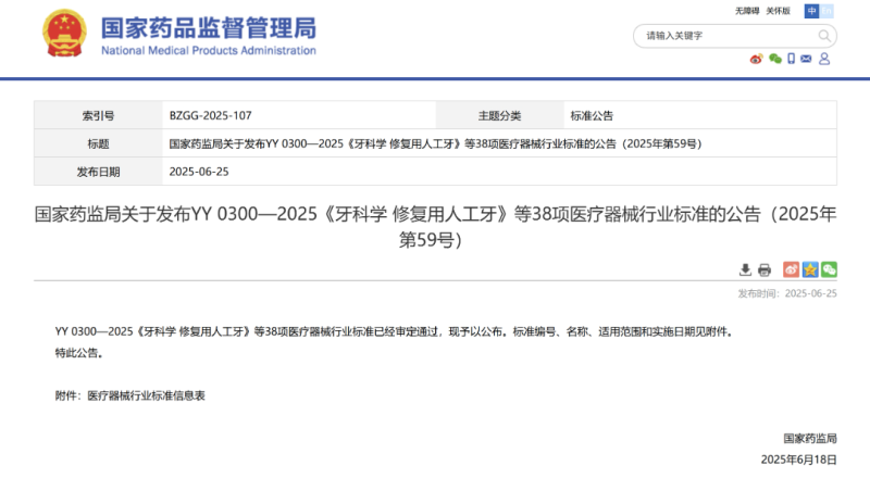 6月25日,國家藥監(jiān)局發(fā)布YY 0300—2025《牙科學 修復用人工牙》、YY 0780—2025《中醫(yī)器械 電針治療儀》、YY/T 1973—2025《醫(yī)用下肢外骨骼機器人》、YY/T 1975—2025《遠紅外磁療貼(袋)》、YY/T 1979—2025《中醫(yī)器械刮痧器具》等38項目醫(yī)療器械行業(yè)標準,其中13項標準為修訂,25項標準是新制定,最早自2026年7月1日起實施。