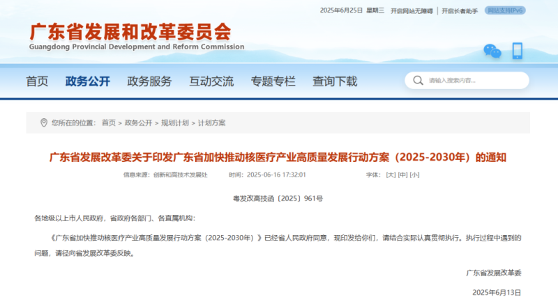 近日,廣東省發(fā)展和改革委員會(huì)發(fā)布《廣東省加快推動(dòng)核醫(yī)療產(chǎn)業(yè)高質(zhì)量發(fā)展行動(dòng)方案(2025-2030年)》(以下簡(jiǎn)稱《方案》),從提升核醫(yī)療科技創(chuàng)新水平、健全醫(yī)用同位素供應(yīng)體系等8方面共提出了20條措施,《方案》全文如下: